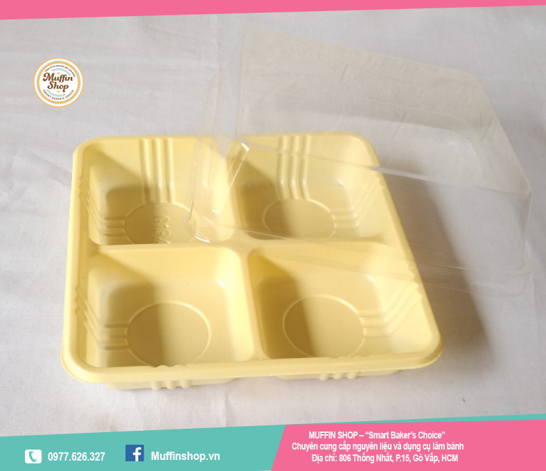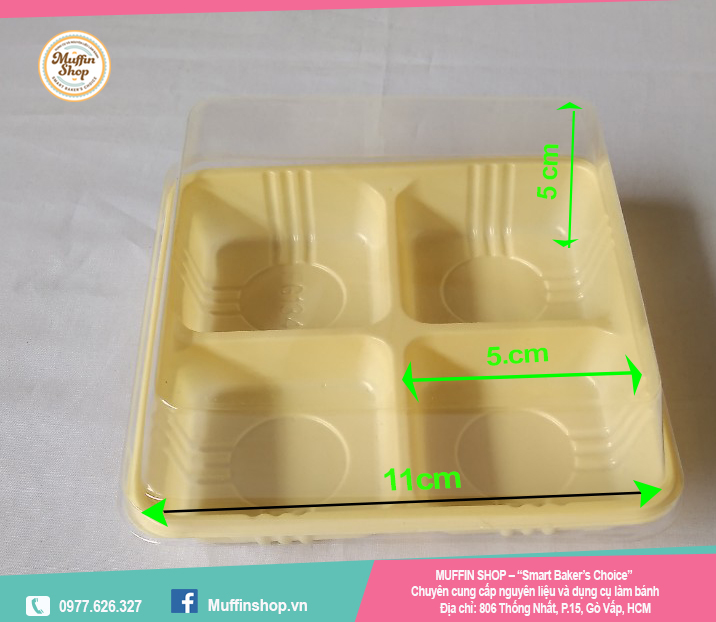 - Kích thước lọt lòng mỗi ngăn 5cm x 5 cm, mỗi ngăn đựng vừa bánh 50 gram